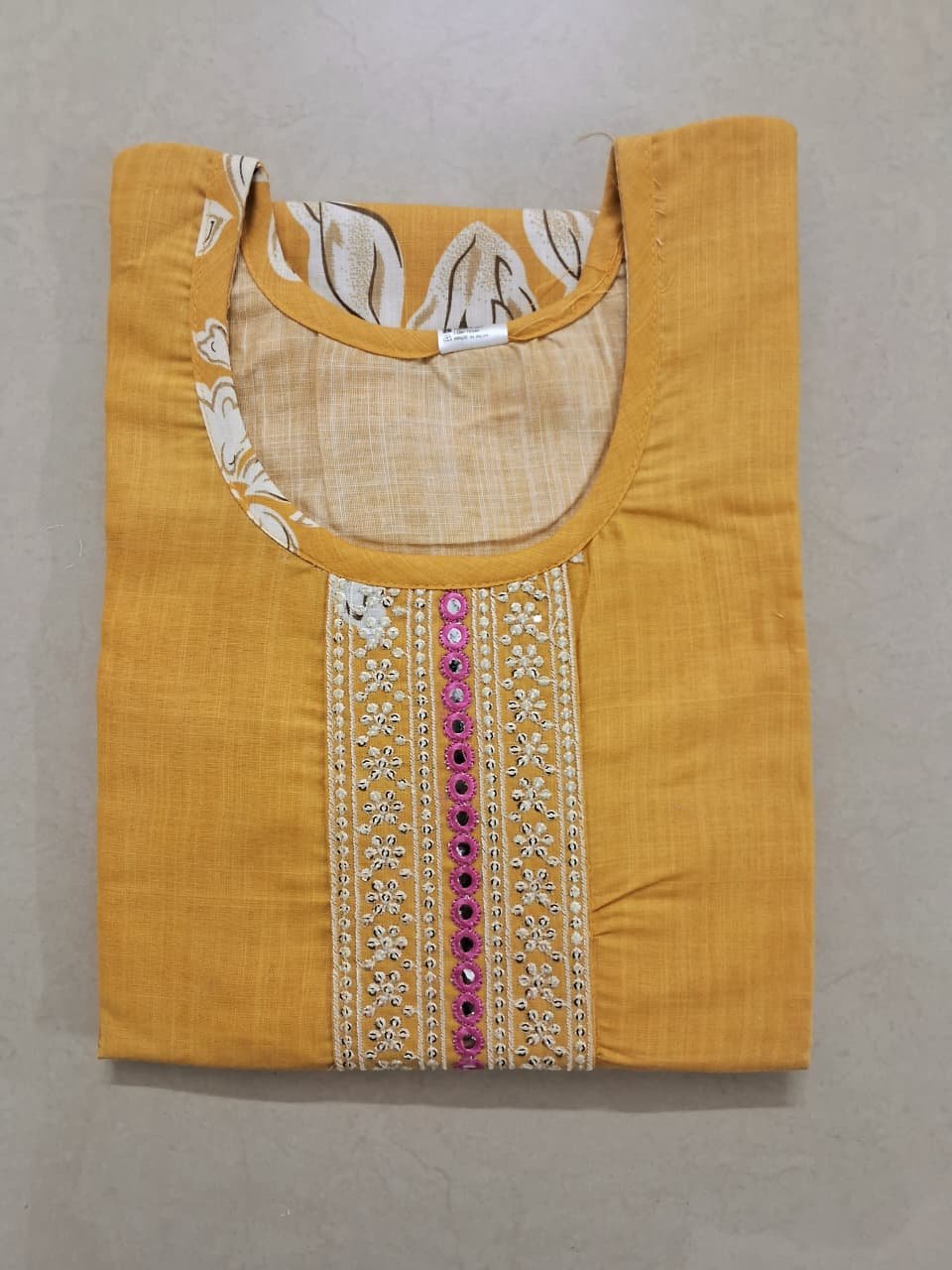 Elevate your ethnic wardrobe with this stunning yellow cotton kurti designed for comfort and elegance. Crafted from 100% pure cotton fabric, this kurti ensures breathability and softness, making it perfect for all-day wear. The bright yellow base is adorned with delicate floral prints and intricate embroidered detailing on the neckline, adding a graceful touch to your everyday and festive style.