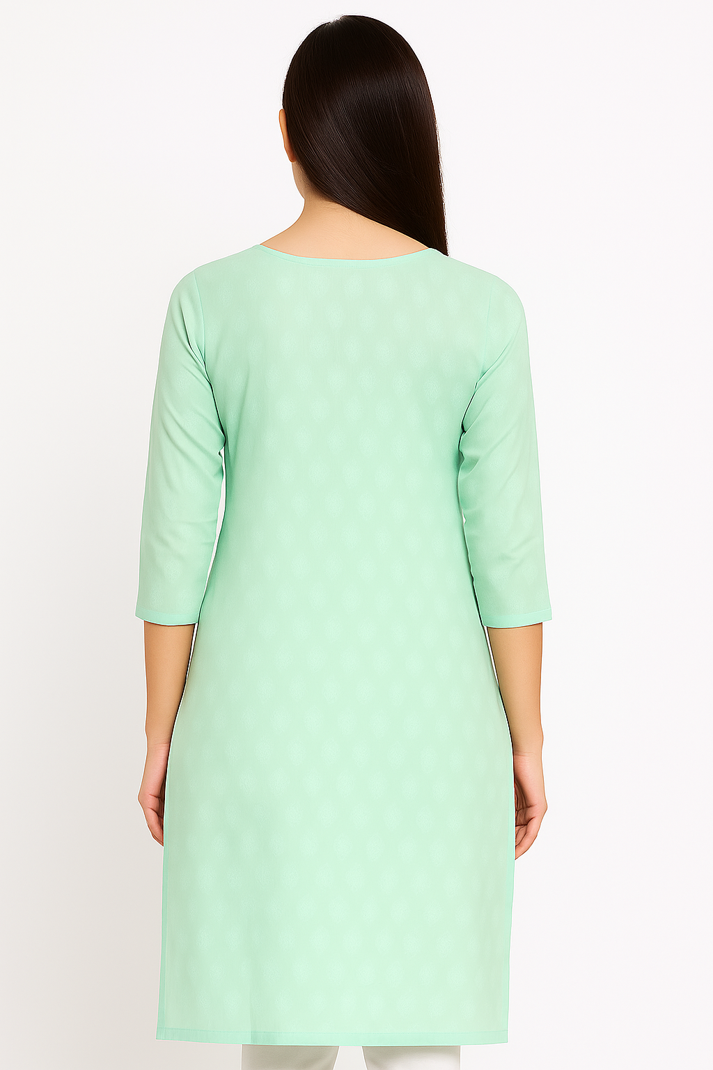This elegant mint green kurti is designed in breathable cotton fabric, making it perfect for both casual and semi-formal wear. The front features delicate white floral embroidery combined with red mirror work accents, adding a touch of traditional charm. With a round neckline, three-quarter sleeves, and straight-cut silhouette, this kurti offers a comfortable yet stylish fit.